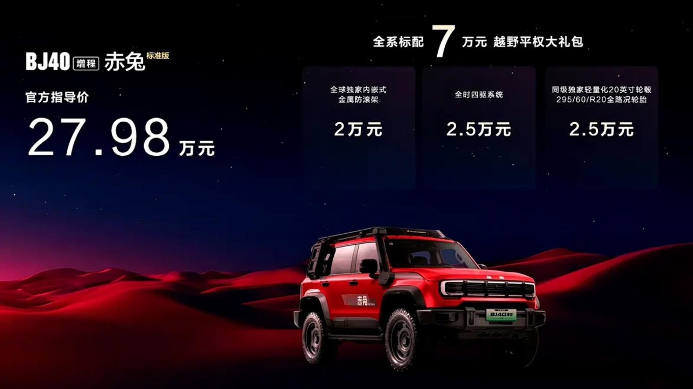 作为本次发布的重头戏,BJ40增程赤兔标准版正式上市,官方指导价27.98万元。新车以官方改装套件为切入点,将越野玩家常见的升级配置直接纳入原厂方案,提供合规与个性化兼备的新选择。