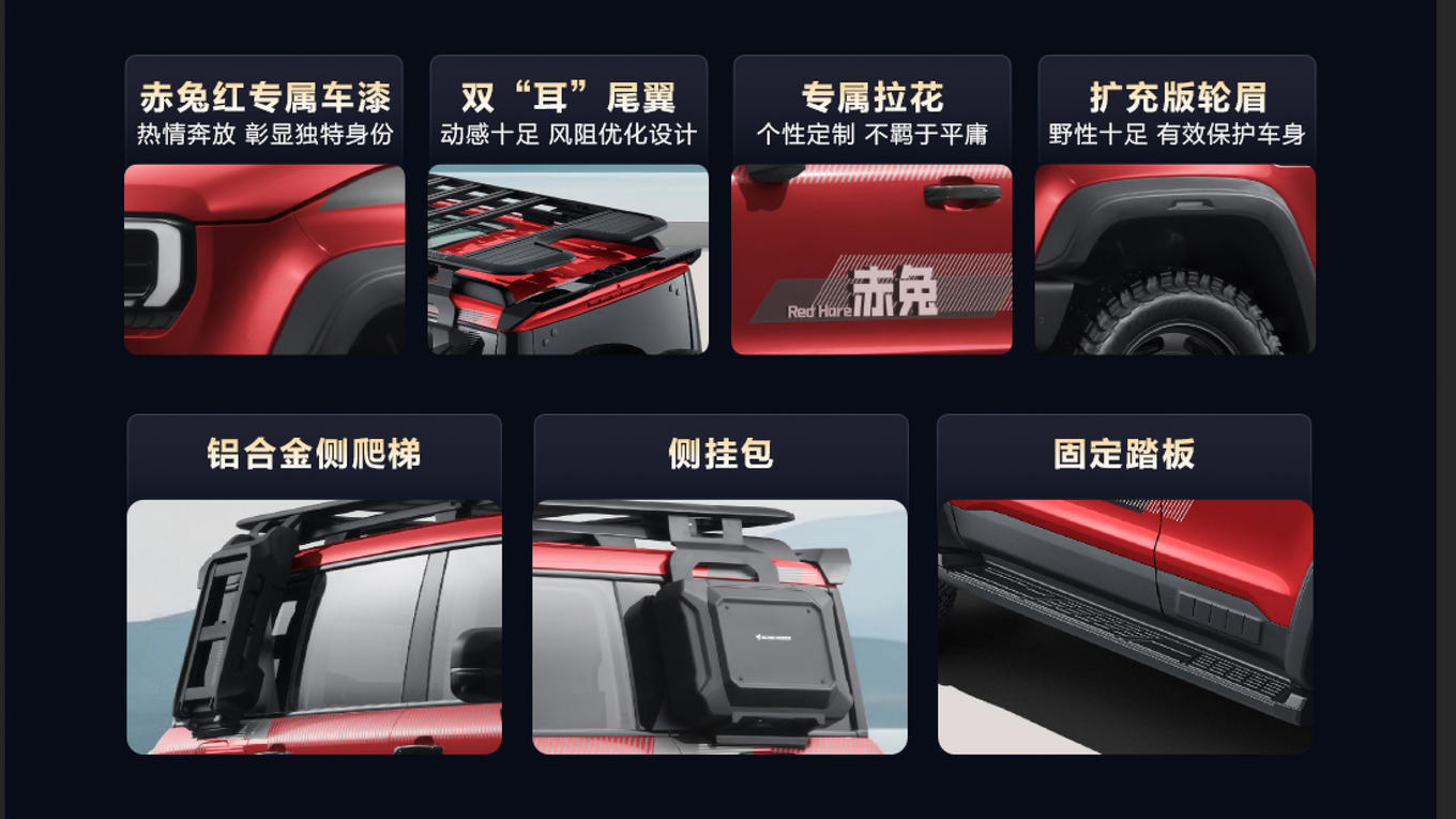BJ40增程赤兔标准版搭载“赤兔红”专属车色,配有定制拉花、扩充版轮眉、双耳造型尾翼,整体风格更加鲜明。车辆原厂配备铝合金爬梯、侧挂包、固定踏板等实用装备,并采用模块化一体式前后保险杠,在保证防护能力的同时,兼顾轻量化需求。