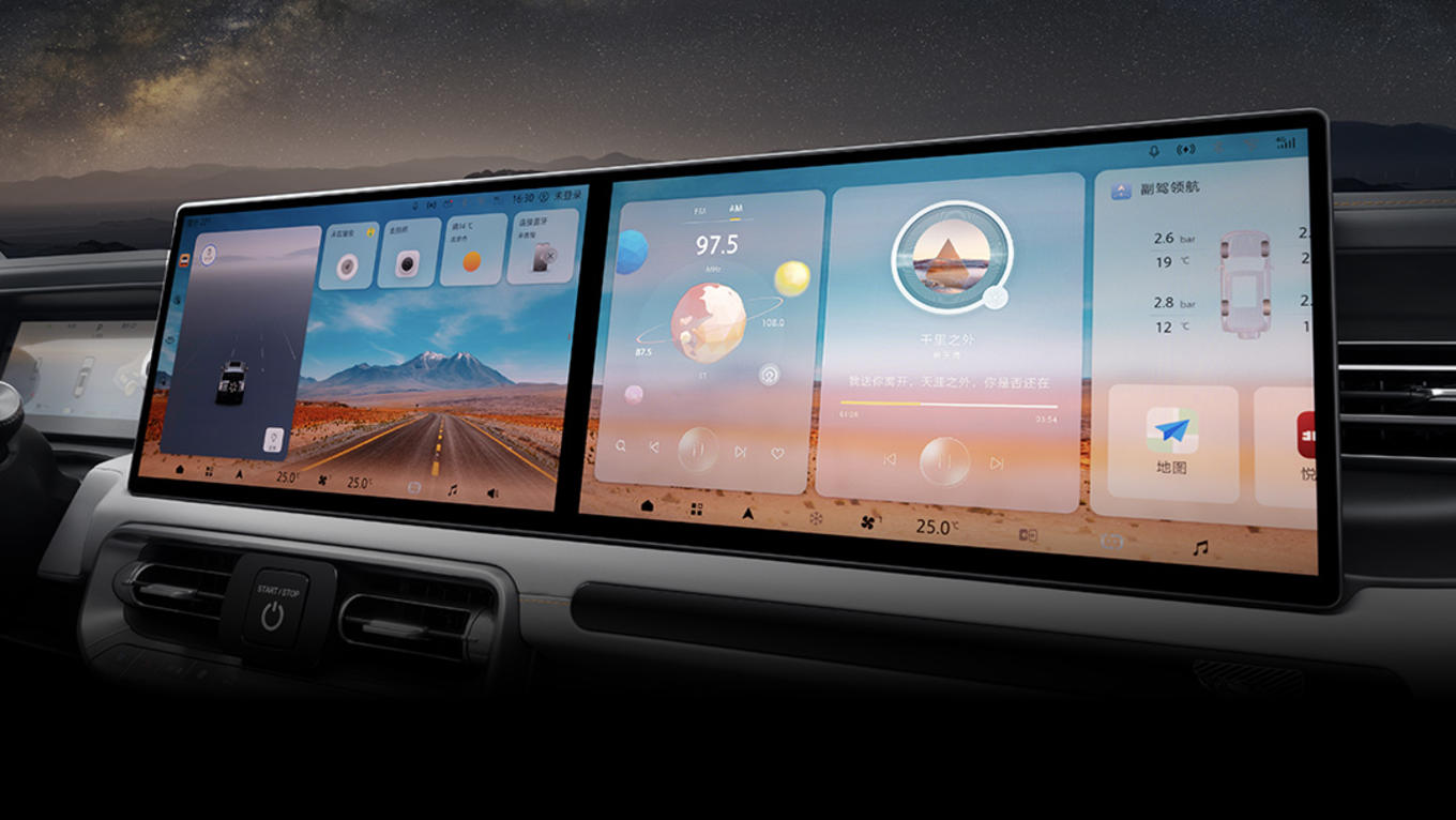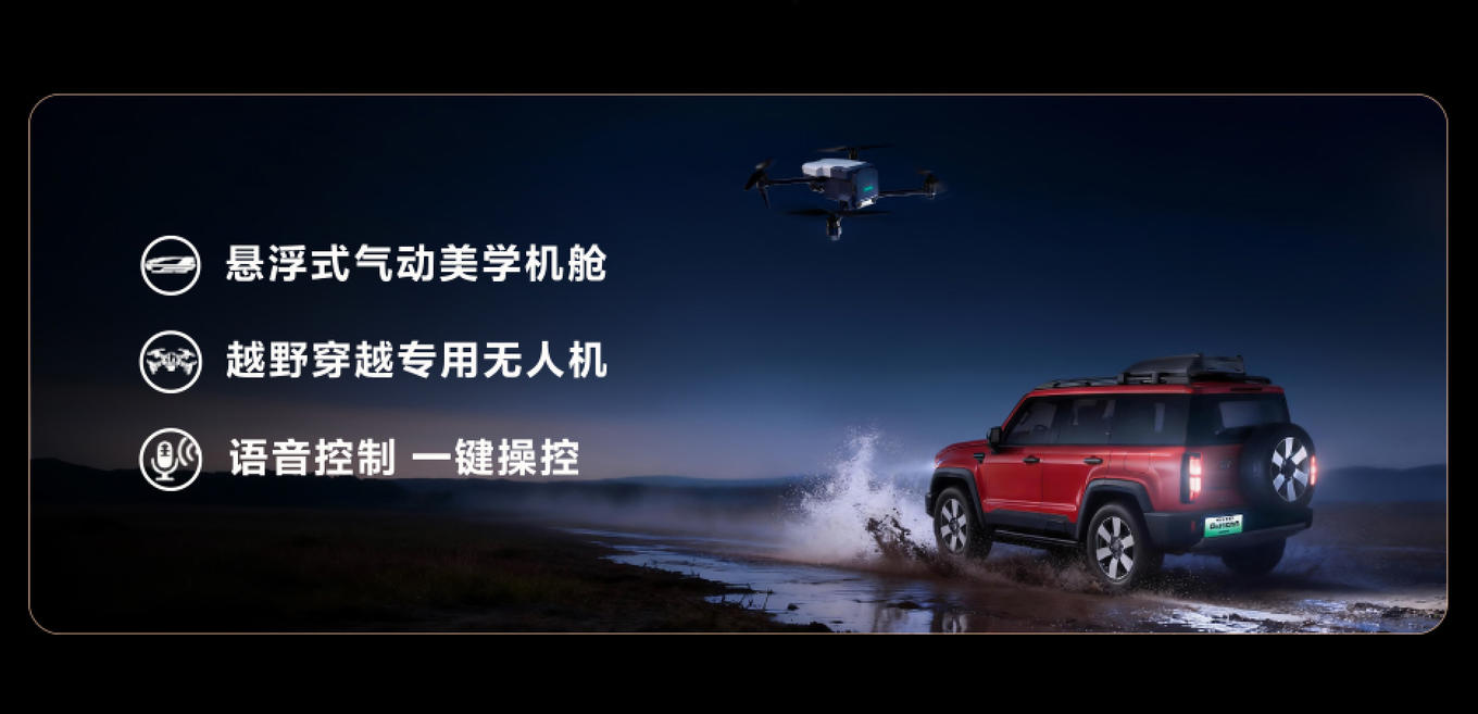 该车对车载无人机系统进行了深度整合,配合悬浮式气动美学机舱,可实现车机系统直连越野专用无人机,进行开关机舱、操控无人机起飞等操作。同时,系统支持语音控制、自动跟拍、智能运镜和AI一键成片,影像内容可实时回传至车机系统,在车队行进、领队探路及复杂路况判断等场景中,提供更直观的信息帮助。