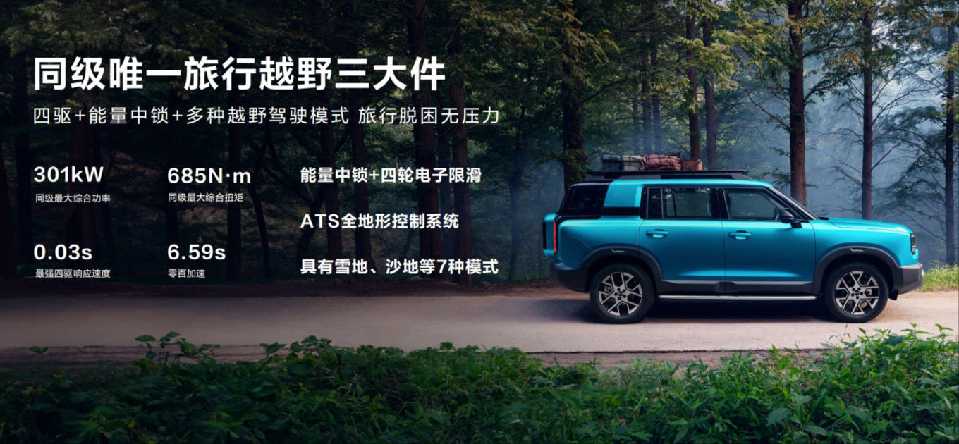 新车搭载“旅行越野三大件”,包括四驱系统、能量中锁及多种越野驾驶模式。其四驱系统拥有0.03秒的响应速度,帮助车辆在复杂路况下快速作出应对;能量中锁可智能分配扭矩,提升越野脱困能力。该车提供雪地、沙地、泥地、涉水等7种驾驶模式,兼顾轻越野和日常驾驶需求。