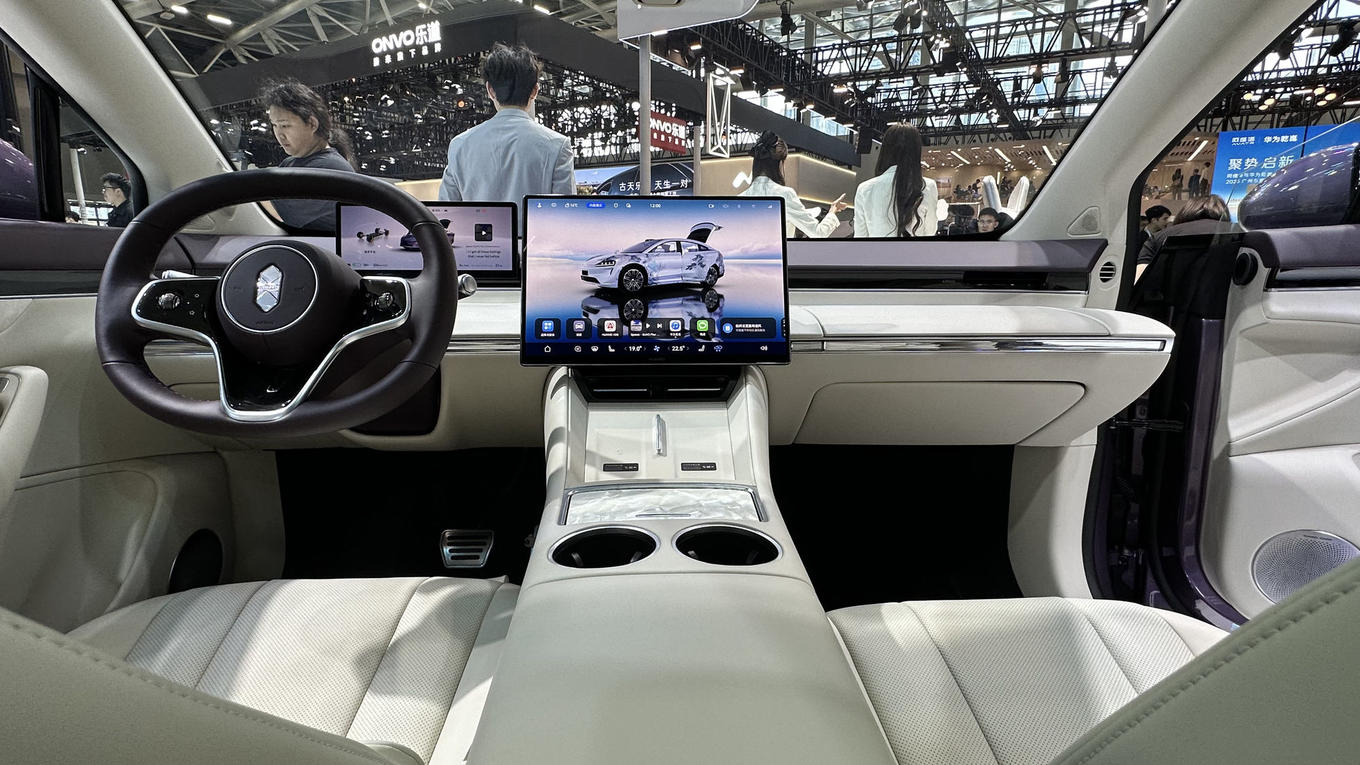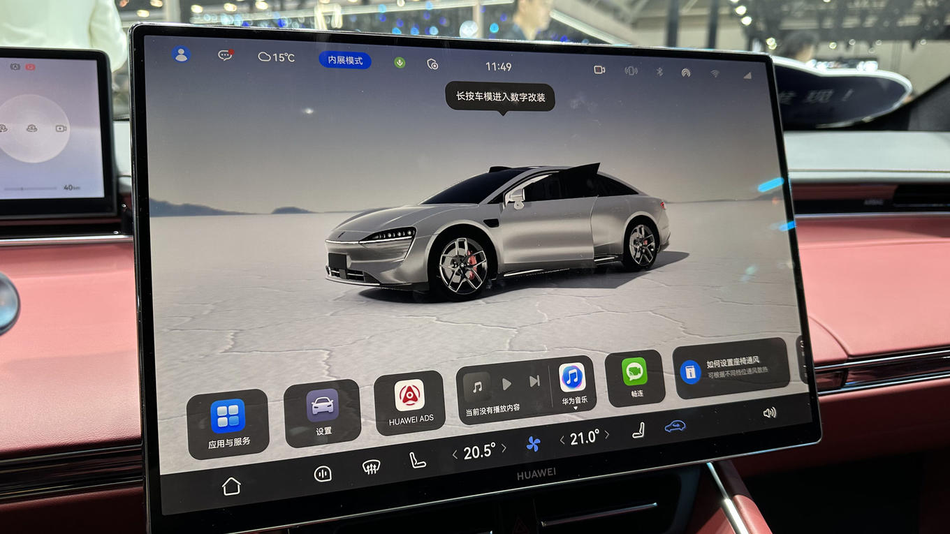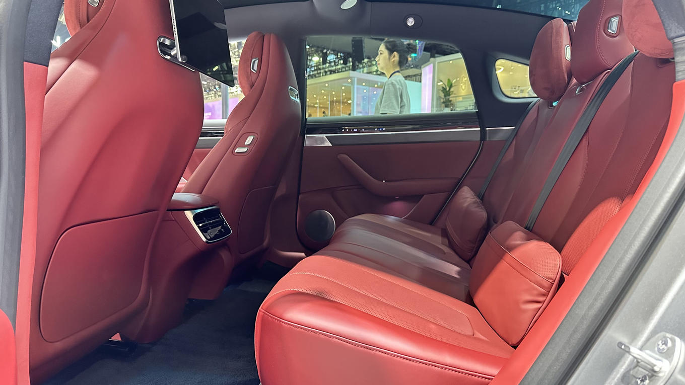 展台上的智界新S7,定位中大型轿车市场,共有三款配置,售价区间22.98万元至28.98万元。车辆全系搭载华为ADS 4辅助驾驶系统,具备高阶识别与决策能力,覆盖高速、城市道路与复杂泊车场景,包括车位到车位的领航辅助、VPD泊车代驾等功能。
